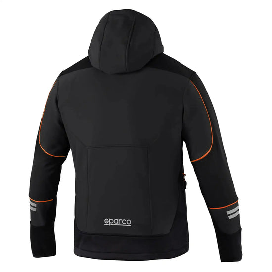 La chaqueta softshell Sparco Tech York Negro/Naranja es perfecta tanto para los profesionales como para los entusiastas de las actividades al aire libre, ya que ofrece protección contra los elementos al tiempo que garantiza un estilo moderno y deportivo.