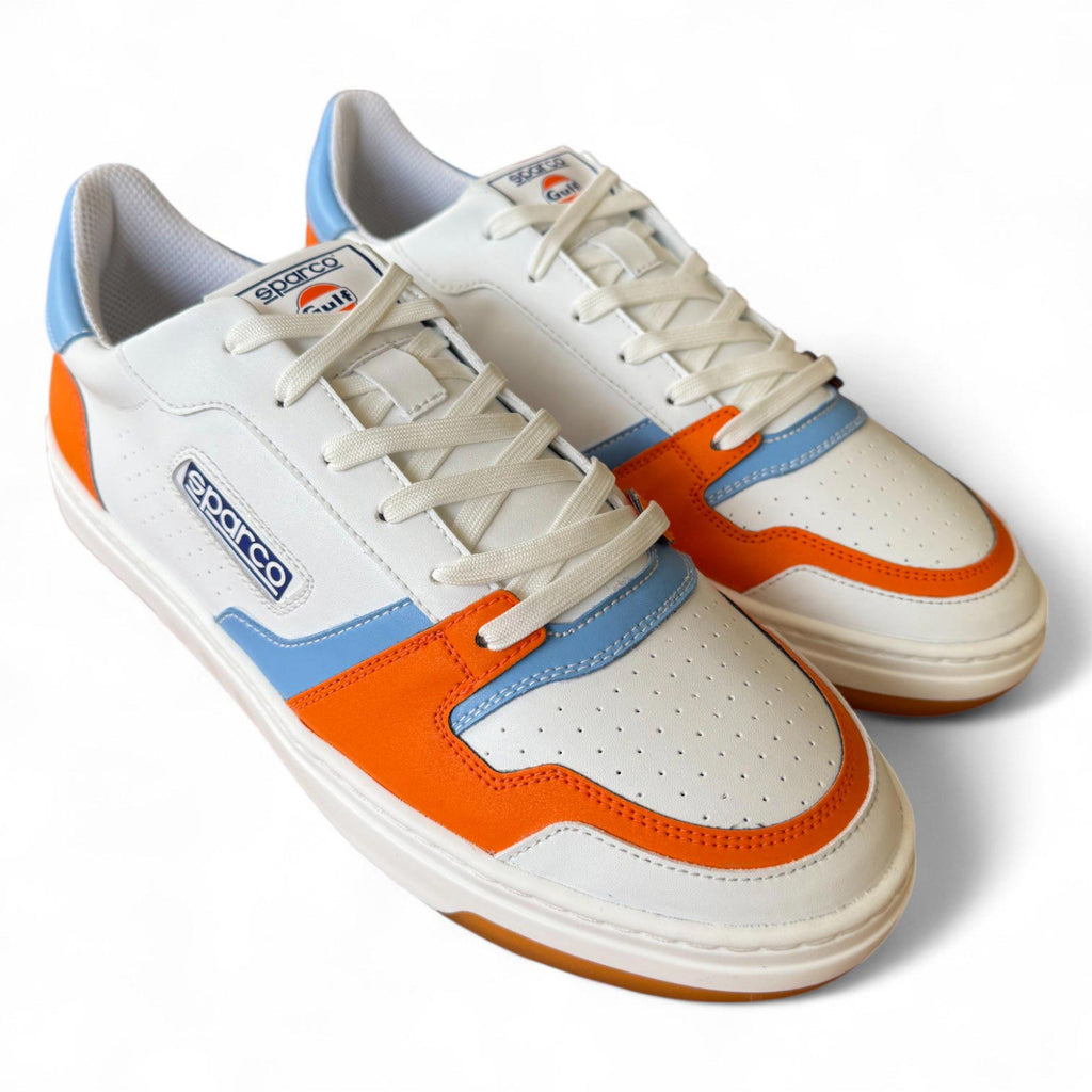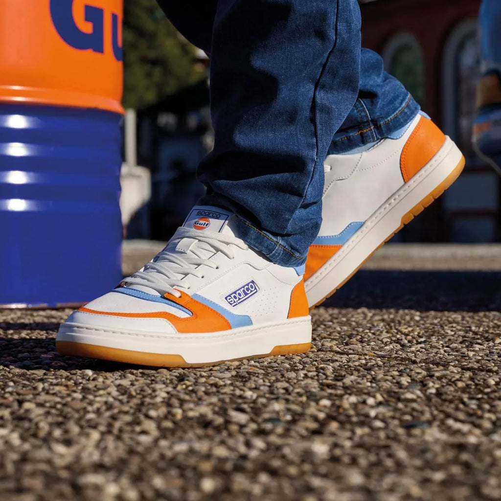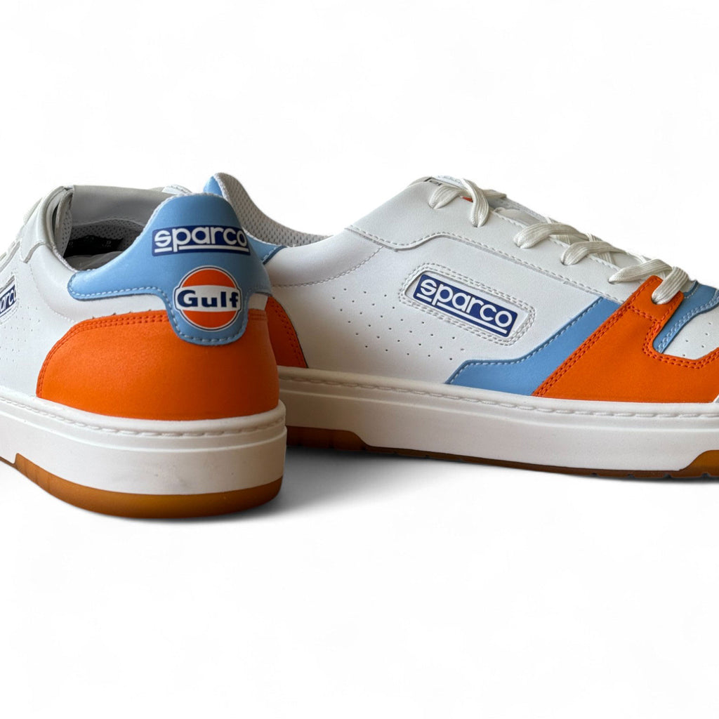 - Logotipos Gulf y Sparco: el logotipo Gulf aparece en la lengüeta y el talón, mientras que el logotipo Sparco está sutilmente fijado en los laterales para un acabado auténtico.