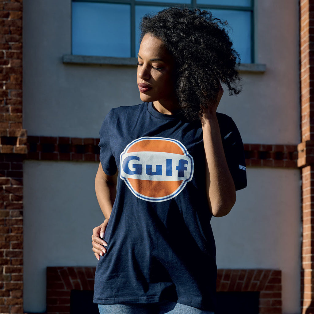Muestra con orgullo tu pasión por el mundo del automóvil con esta camiseta Sparco Gulf Gran Logo. Con el icónico logo Gulf sobre un elegante fondo azul marino, esta camiseta combina elegancia y autenticidad.